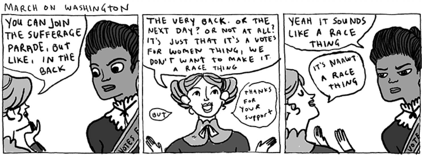 Unfortunately, intersectionality is often ignored when we talk about equality for women in STEM. Indeed, Ida B. Wells, a pioneering figure in the American civil rights movement experienced this when she was asked to march at the back of the line during the Suffrage parade in Washington in 1913. Kate Beaton describes this in a fantastic comic here;