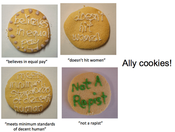 In other words, it’s the act of seeking approval and praise for doing something that we should all be doing anyway. Believing that women should receive equal pay for equal work, or that women shouldn’t be sexually harassed, or calling out sexist comments online are all examples of things that we should all be doing anyway and doesn’t deserve special kudos. A flickr user demonstrated this by baking actual ‘ally cookies’ which are hilarious and look delicious at the same time.