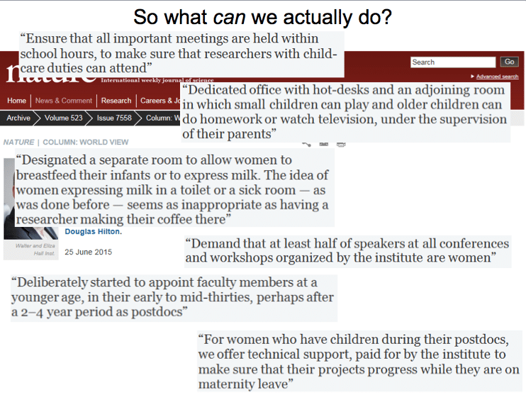 Jonathan Eisen (@phylogenomics), professor at UC Davis and advocate for female representation in STEM, in particular at academic conferences. Jonathan gave a neat and concise statement of the problem, which is that there are implicit and explicit biases against women in science and that we all should be doing something to try and correct for this and fix this. So Jonathan’s one recommendation was do something, don’t do nothing, don’t just sit there, comment about it, talk about it, write about it, there’s a lot that can be done.