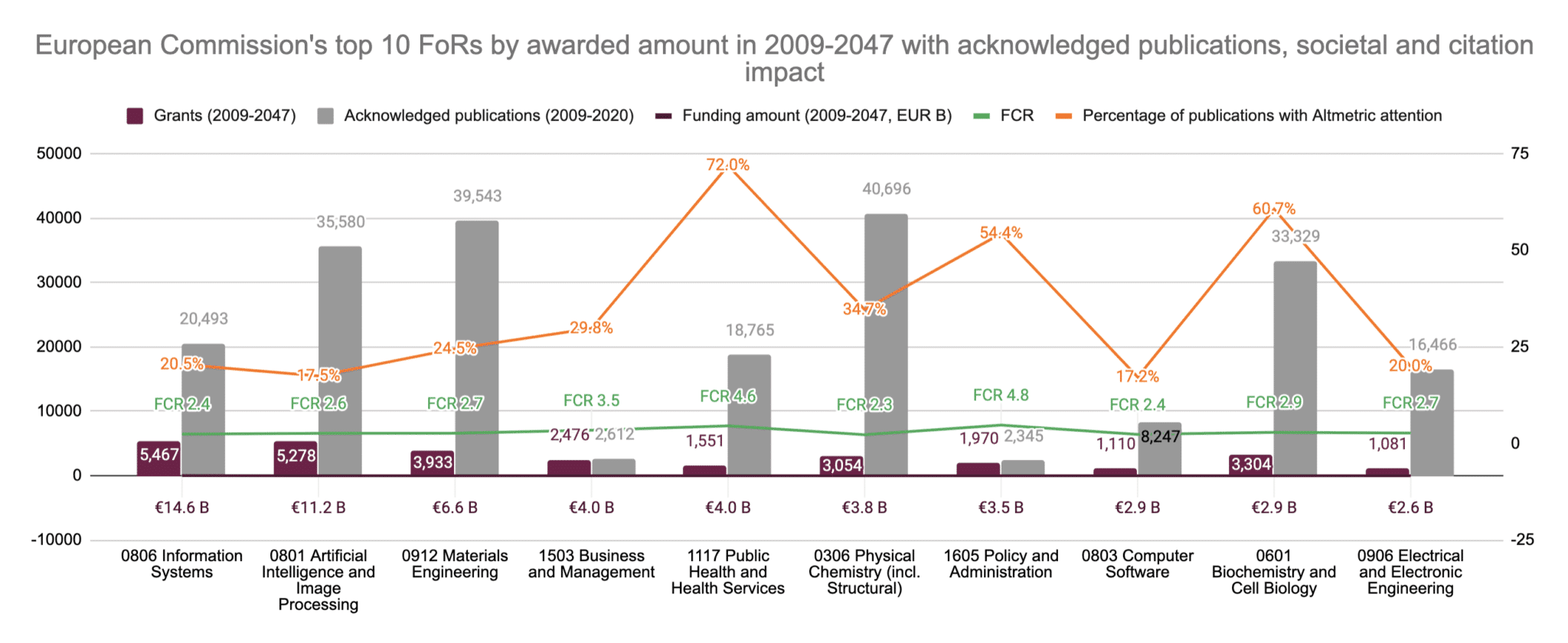 The top 10 disciplines awarded funding have additional metrics such as overall number of grants, acknowledged resulting publications and the impact of those publications expressed through our field weighted metric, FCR. An additional layer of societal impact of the acknowledged publications is expressed through the percentage of publications with attention tracked by Altmetric.