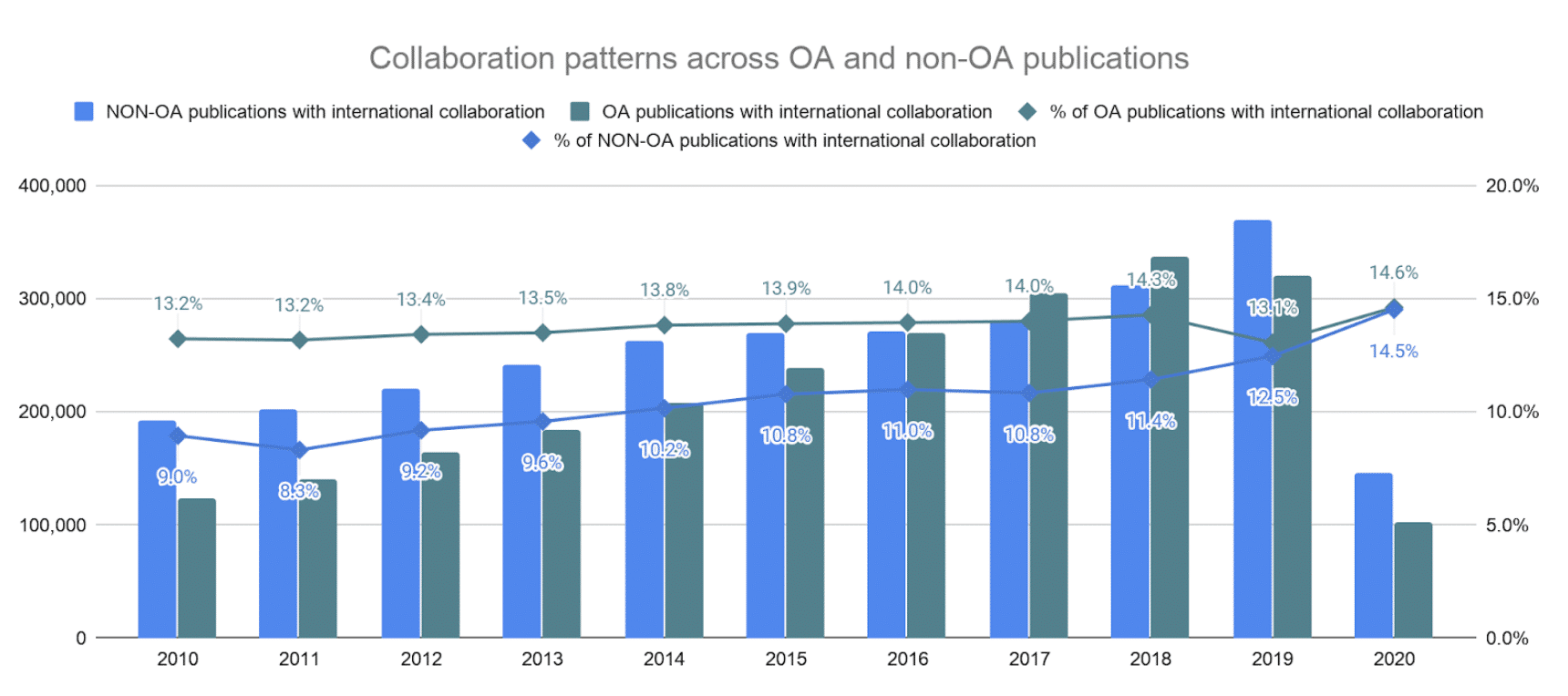 Figure 5: Collaboration patterns across open access and subscription publications between 2010 and 2020, based on Dimensions publications data.