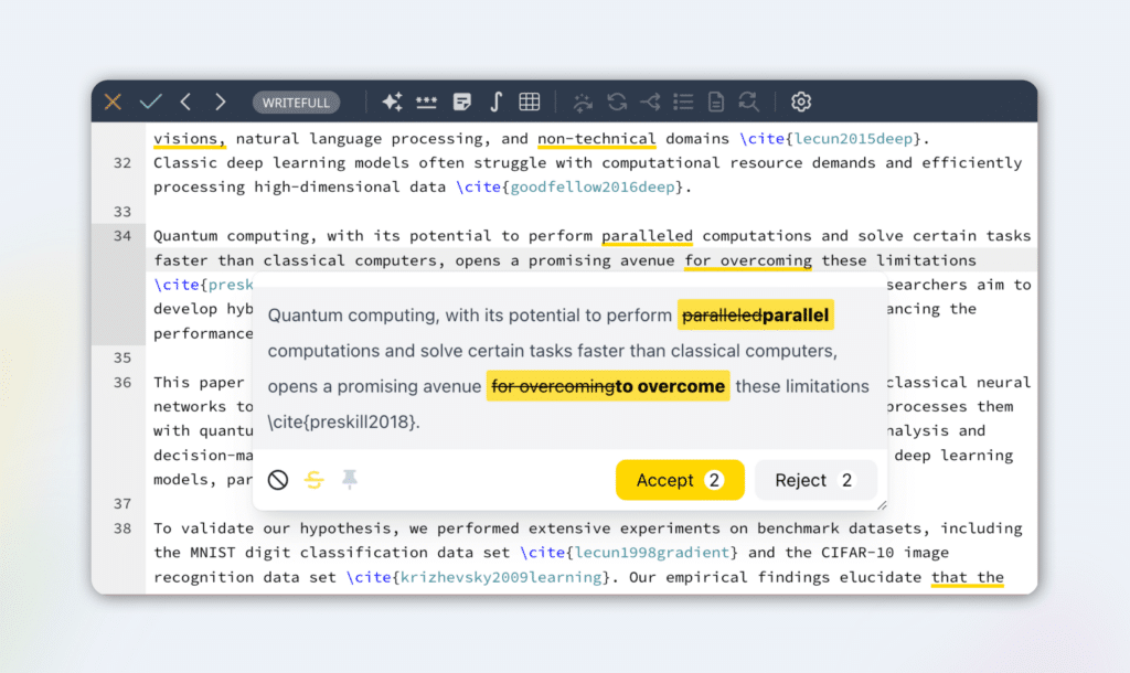 Writefull’s language tools help students and researchers write better, faster, and with confidence. Integrations available for Overleaf and Microsoft Word.
