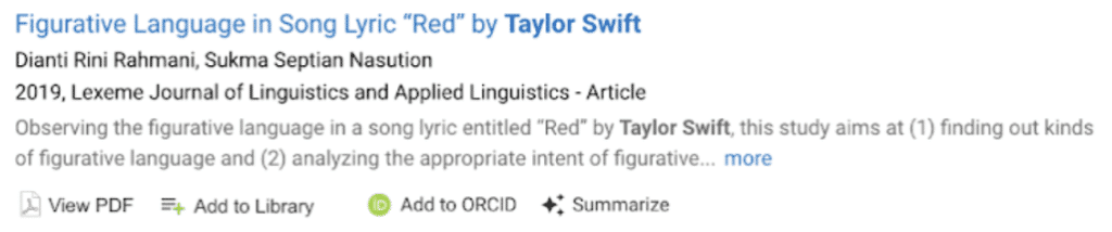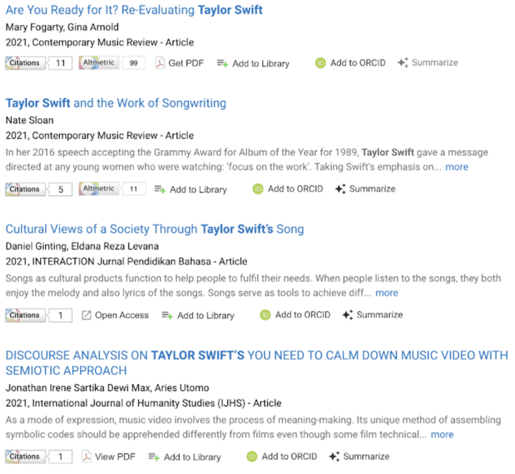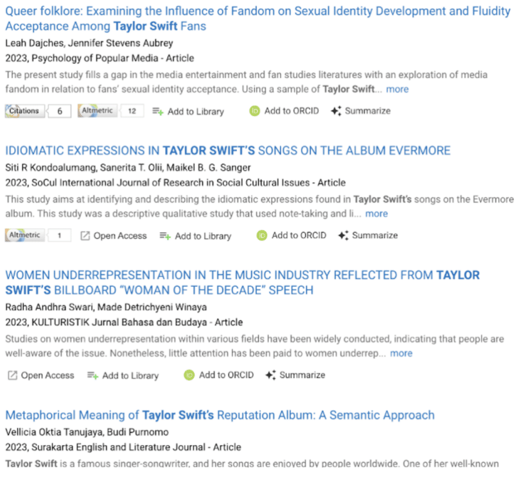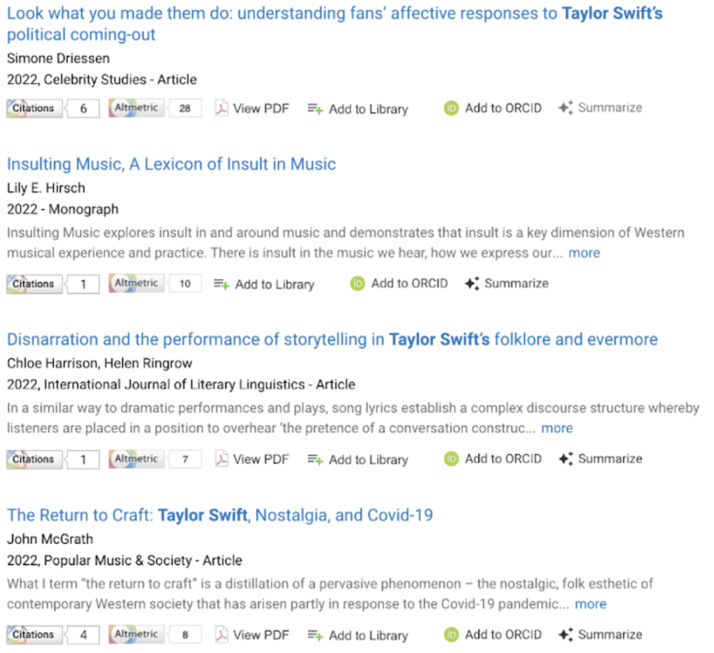 But back to the topic at hand. A quick glance at the top line of research outputs shows that, to date, 241 publications have “Taylor Swift” in the title or abstract, as well as 14 data sets, three grants, and one clinical trial. Not bad for someone whose debut album came out in 2006.