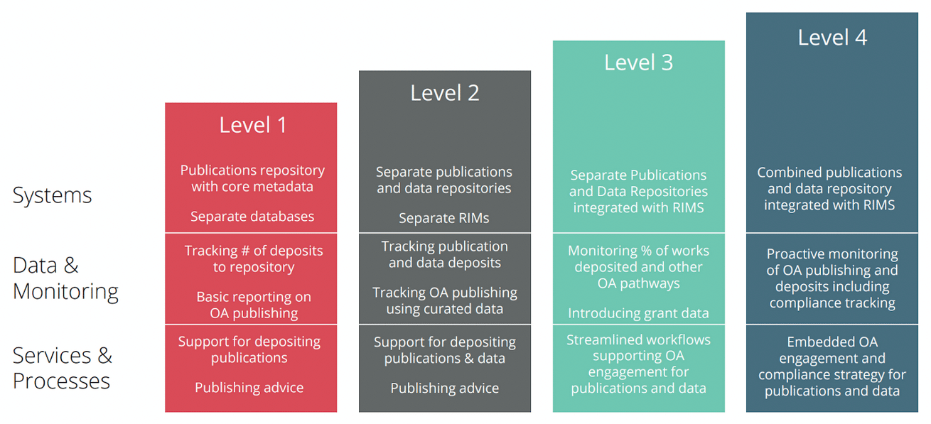 You might find yourself at Level 1 right now where you have a publications repository along with some metadata, and you’re able to track a number of deposits and do some basic reporting, but there are a number of ways that you can build this up over time to create a truly integrated OA solution. By bringing together publications and data repositories and integrating them within a research management solution, you can enter a space where you can monitor proactively, with an embedded engagement and compliance strategy across all publications and data.