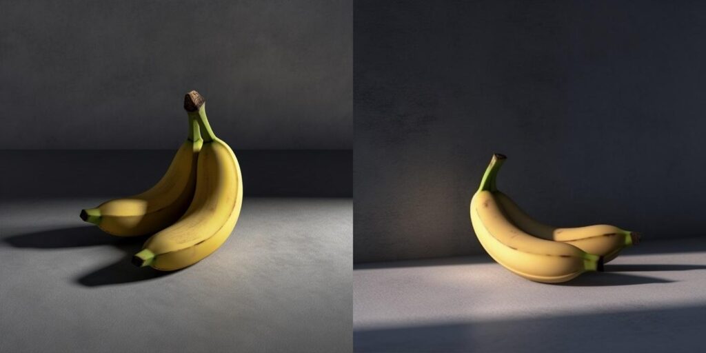 Now, the more astute amongst you may notice an issue with the outputs that Midjourney has produced in Figure 1. While the bananas are beautiful and look extremely tasty in their artistic pose casting their shadow on the grey background, you may notice that I asked for a single solitary banana, on its own, but none of the variants that I received contained just one banana. Of course, I thought, the error must be mine, I clearly must not have been sufficiently precise in my prompt. So, I tried variants – from “a perfect ripe banana on a pure grey background casting a light shadow, hyperrealistic”, to the more specific “a single perfect ripe banana alone on a pure grey background casting a light shadow, hyperrealistic photographic”, and even to the emphatic (even pleading) “ONE perfect banana alone on a uniform light grey surface, shot from above, hyperrealistic photographic”.